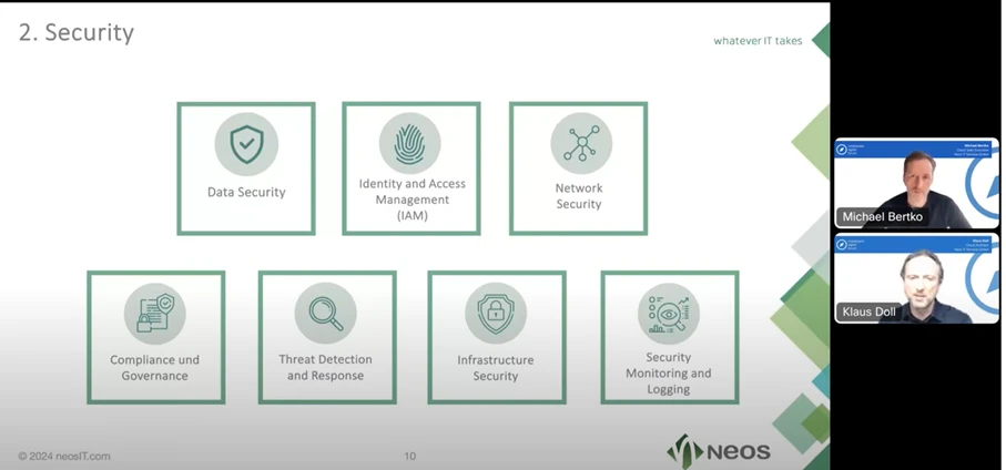 Die Neos IT Services GmbH ist ein führender Anbieter im Bereich Cloud-Architektur und IT-Dienstleistungen. Gegründet im Jahr 2005 und mit Sitz in München, unterstützt Neos IT Unternehmen dabei, sichere und effiziente Cloud-Lösungen zu implementieren. Als Gast bei unserer Veranstaltung, “Cloud im Mittelstand? Aber sicher!“ haben Klaus Doll und Michael Bertko von Neos IT einen informativen Vortrag gehalten, in dem sie ihre Expertise und Praxisbeispiele vorgestellt haben.
