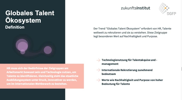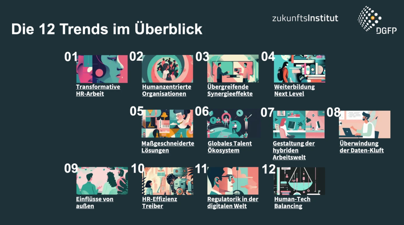 Im Rahmen der DGFP-Studie wurden zwölf Schlüsseltrends identifiziert, die das HR-Management in den kommenden Jahren prägen werden. Diese Trends reichen von der verstärkten Integration moderner Technologien bis hin zur Gestaltung einer menschenzentrierten Arbeitskultur. Besonders hervorzuheben ist, dass die Studie sowohl allgemeine Entwicklungen als auch konkrete Handlungsempfehlungen enthält, die Unternehmen direkt umsetzen können.